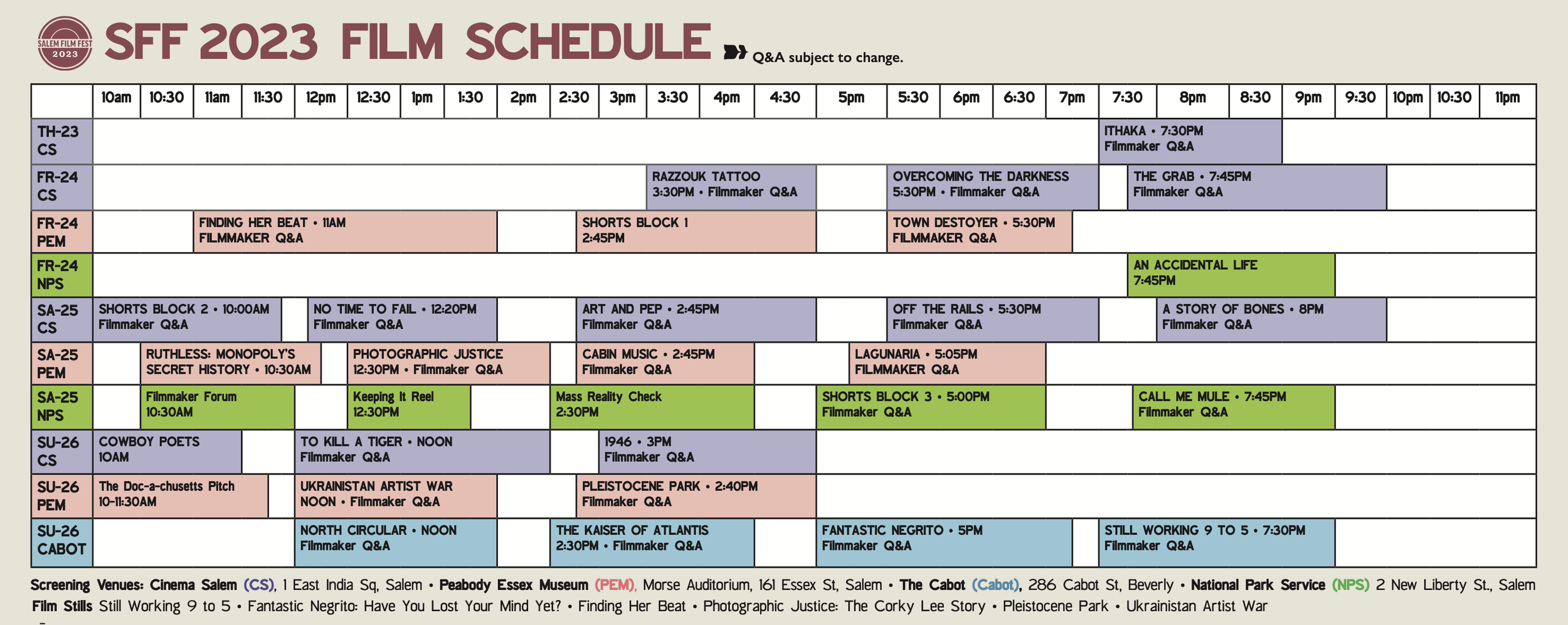 You may download the entire SFF2023 Program by clicking the orange button, or click on the Film Schedule image below to enlarge.